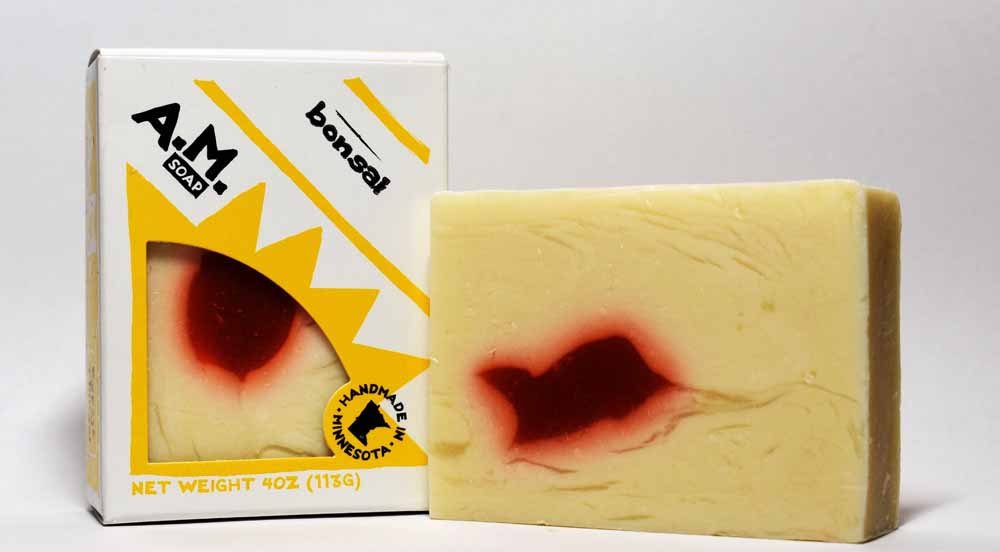 cold-process soap created by hand in small batches using olive oil, distilled water, coconut oil, palm kernel oil, sunflower oil, sodium hydroxide, castor oil, fragrance oil and an array of safe pigments or dye.