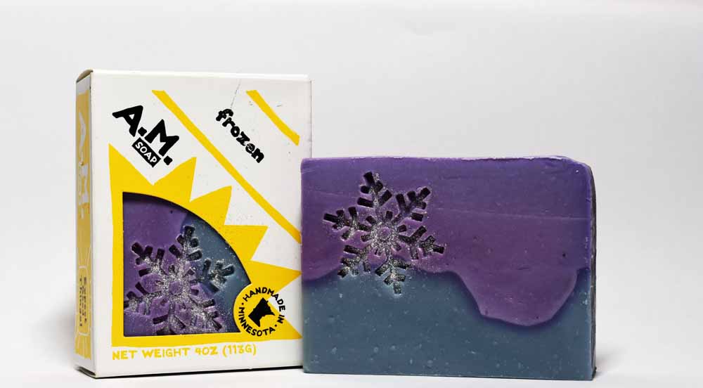 Frozen is all about a winter land saga, but the scent is tropical heliotrope. This fun bar is two-toned in light blue and light purple with a snowflake stamp in silver mica. Kids (and parents) love it!