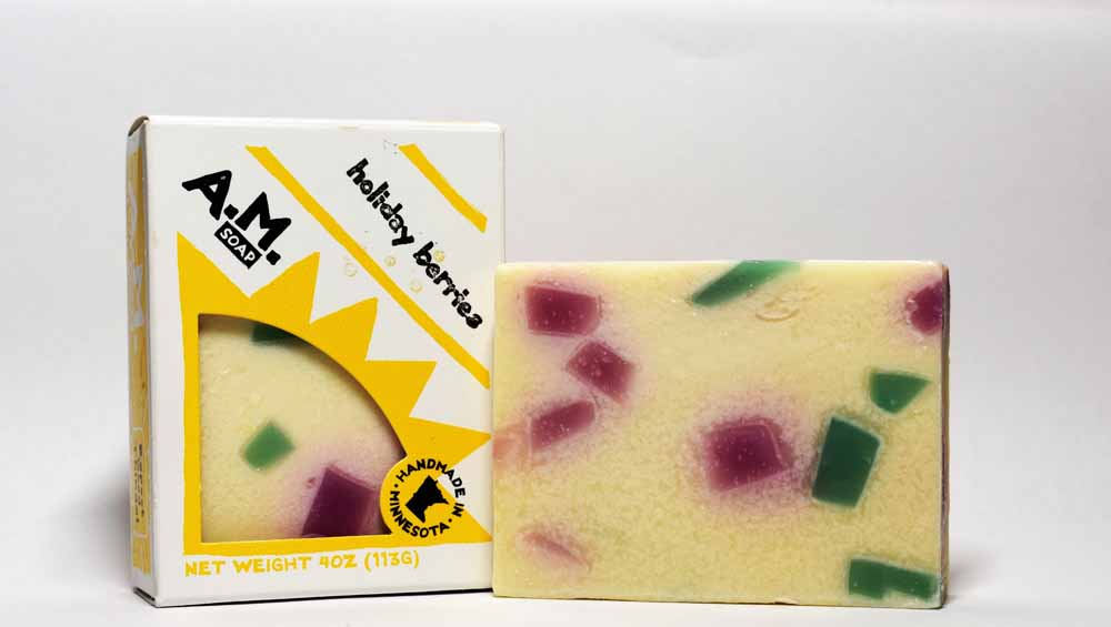 Cranberry, blueberry and raspberry scents mixed in a festive bar of white with green and red accents.